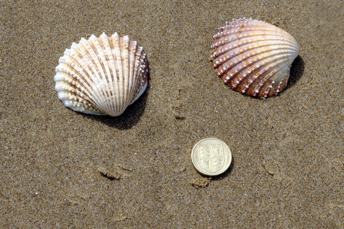 Solid shell covered with small curved spines. 18 - 20 ribs. Up to 3 inches.